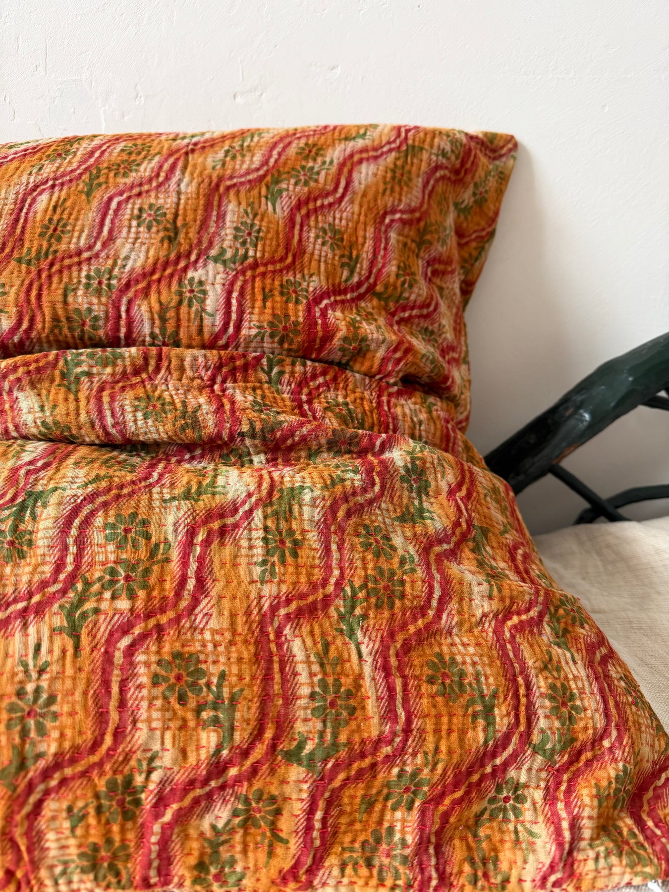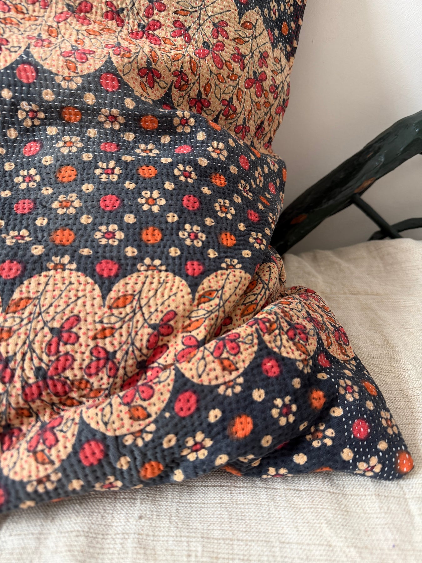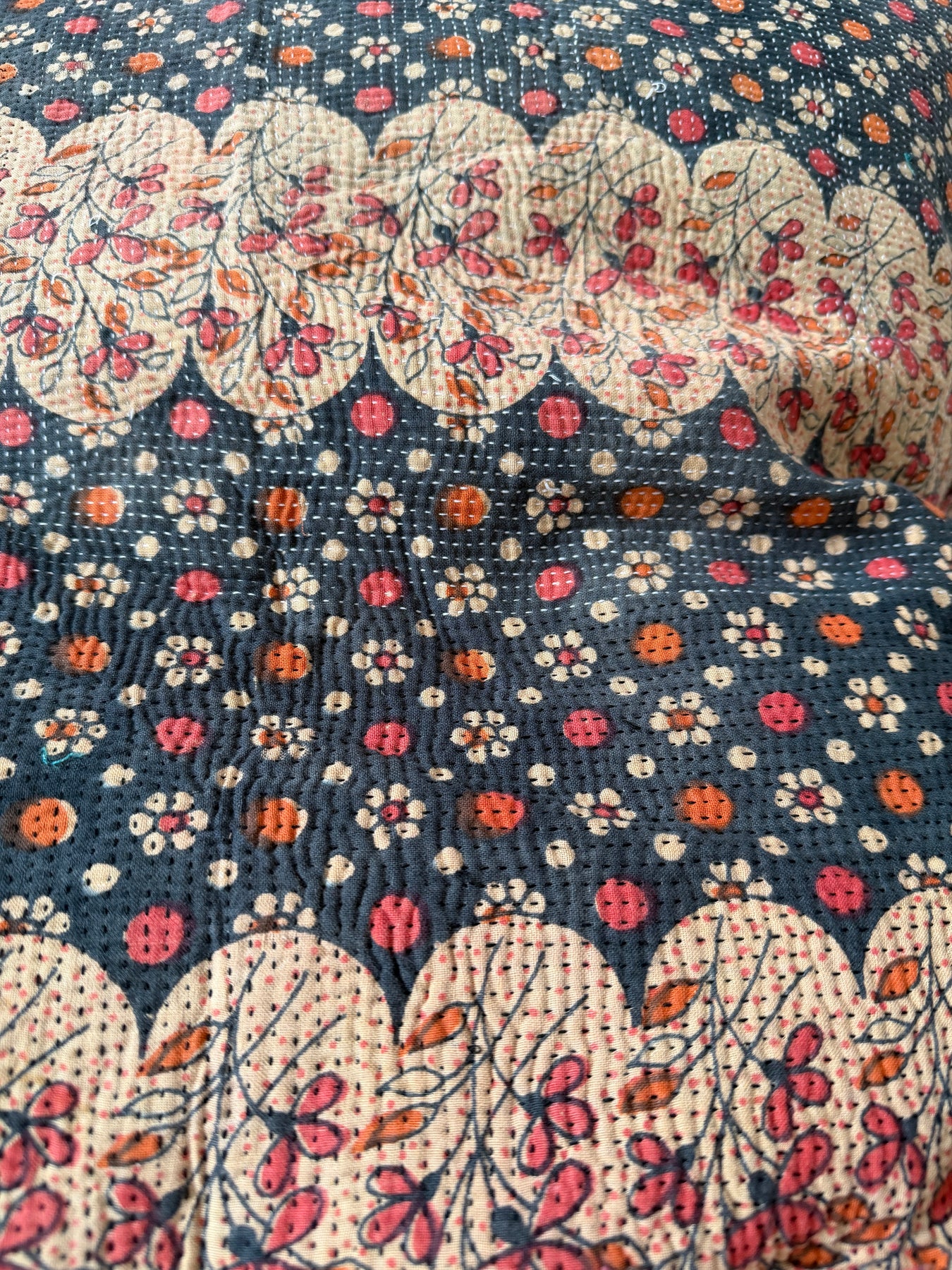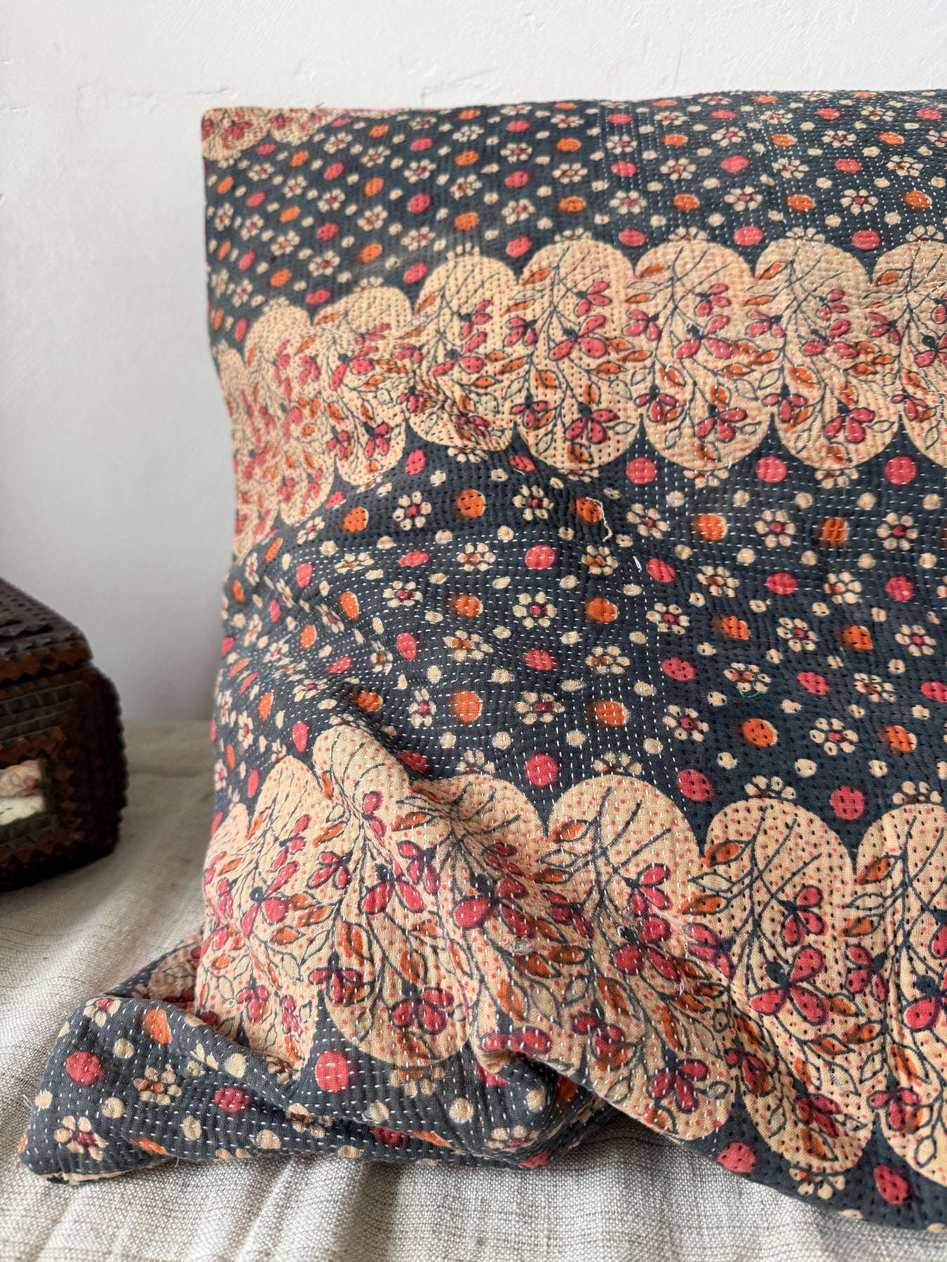 Le Kantha se réfère à un style particulier de travail à la main. Ces pièces ont été trouvées dans le nord de l'Inde. Le kantha est un art traditionnel de broderies. En utilisant Saris et fils colorés pour créer des dessins délicats, les couturières transforment d'anciens Saris en jolies couvertures. 100 % RECYCLAGE