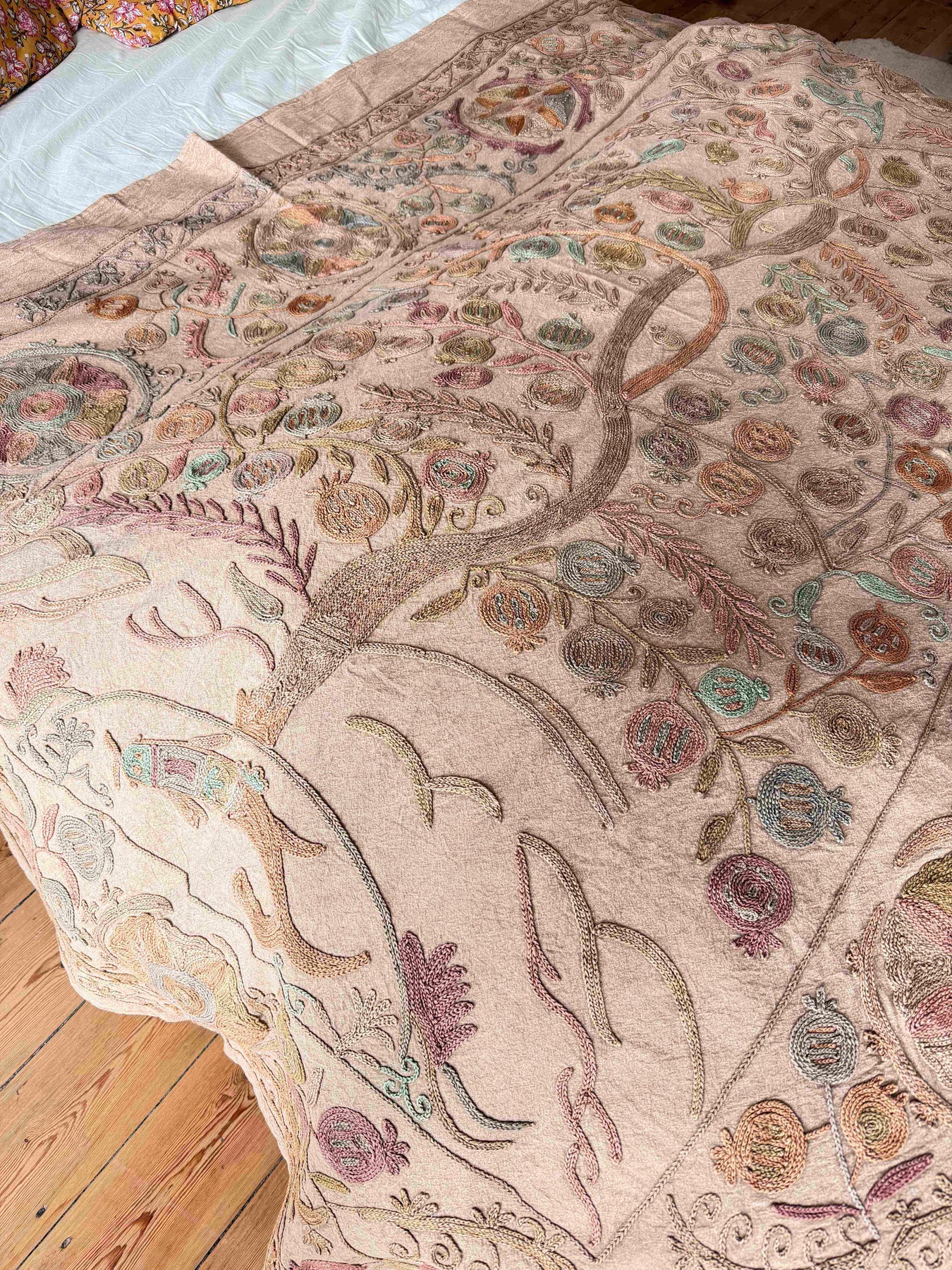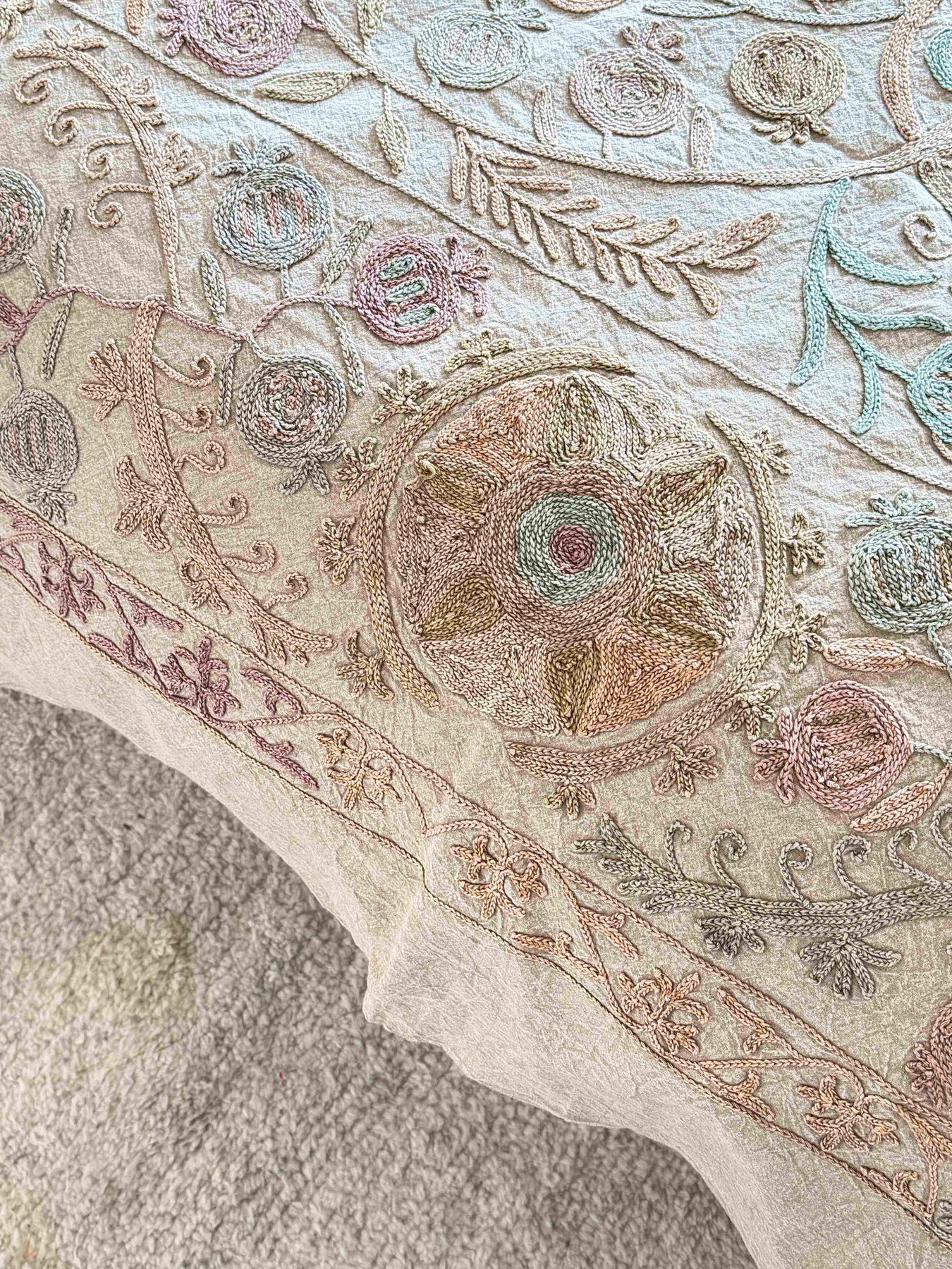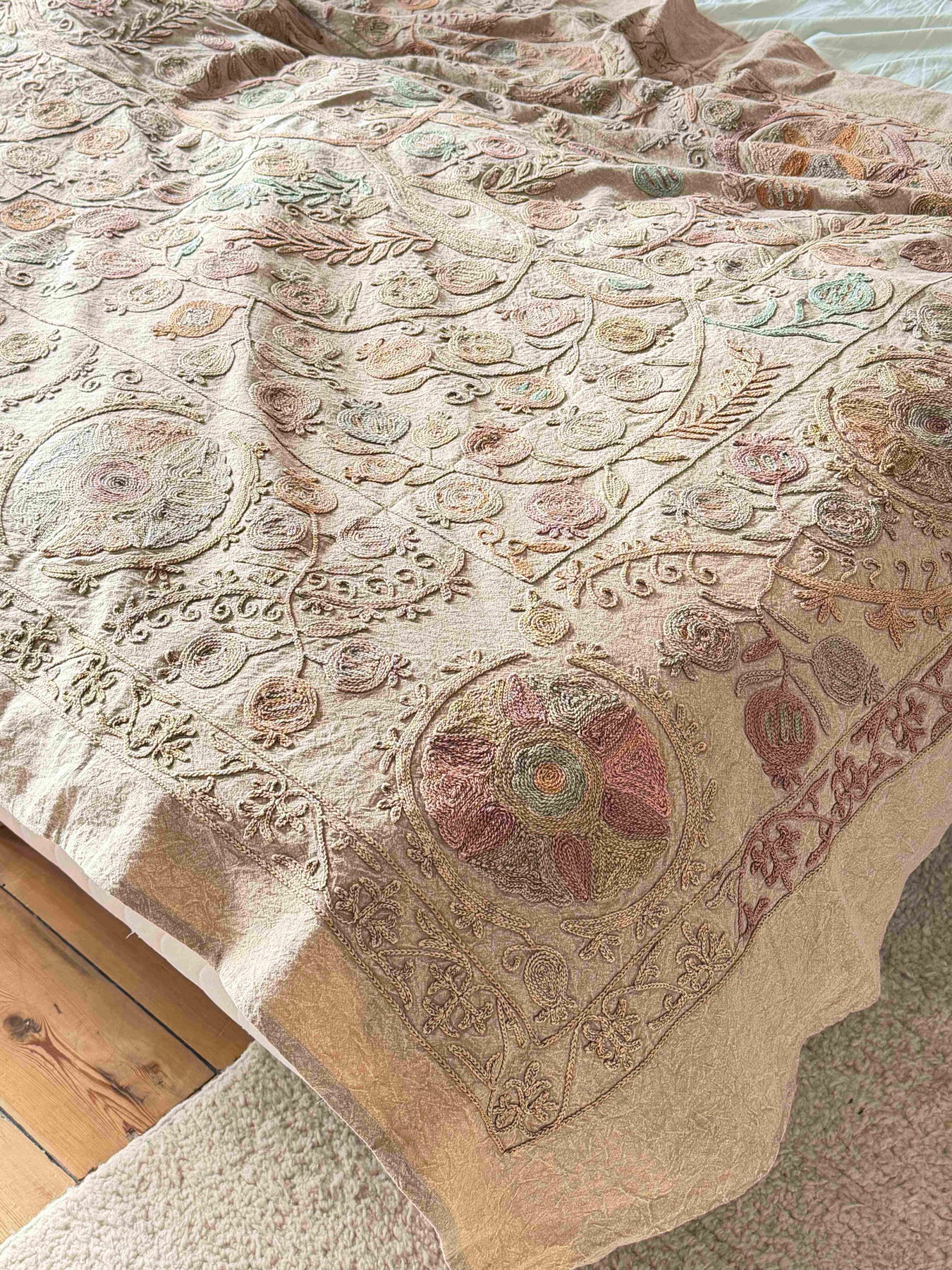 Grand Suzani fait main, broderies main en fil de coton. Cette pièce unique est parfaite pour habiller vos intérieurs