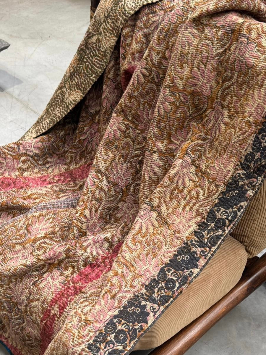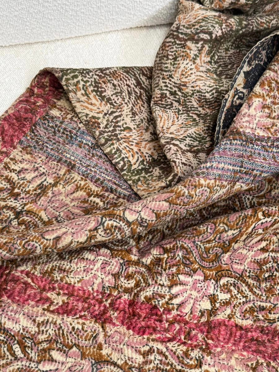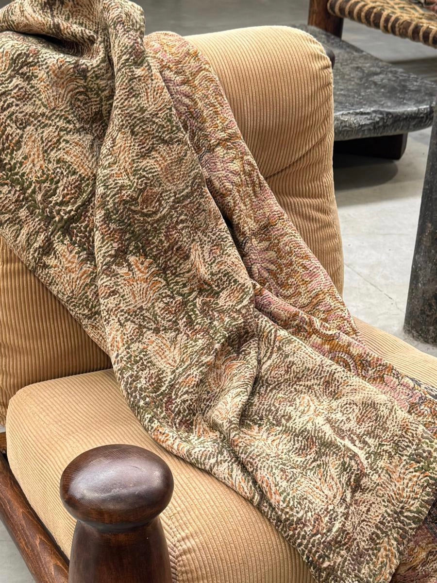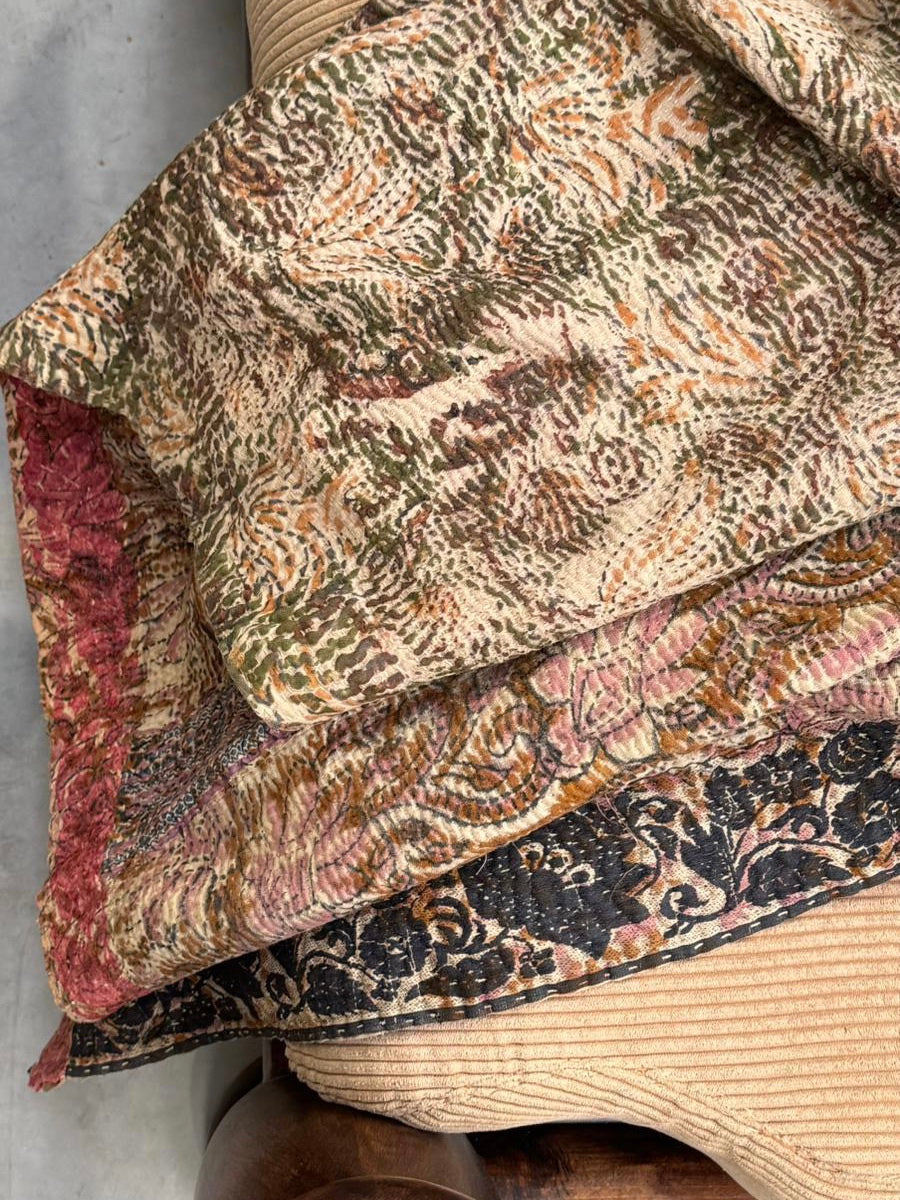 Le kantha est un art traditionnel de broderies, en utilisant Saris et fils colorés pour créer des dessins délicats, les couturières transforment d'anciens Saris en jolies couvertures.