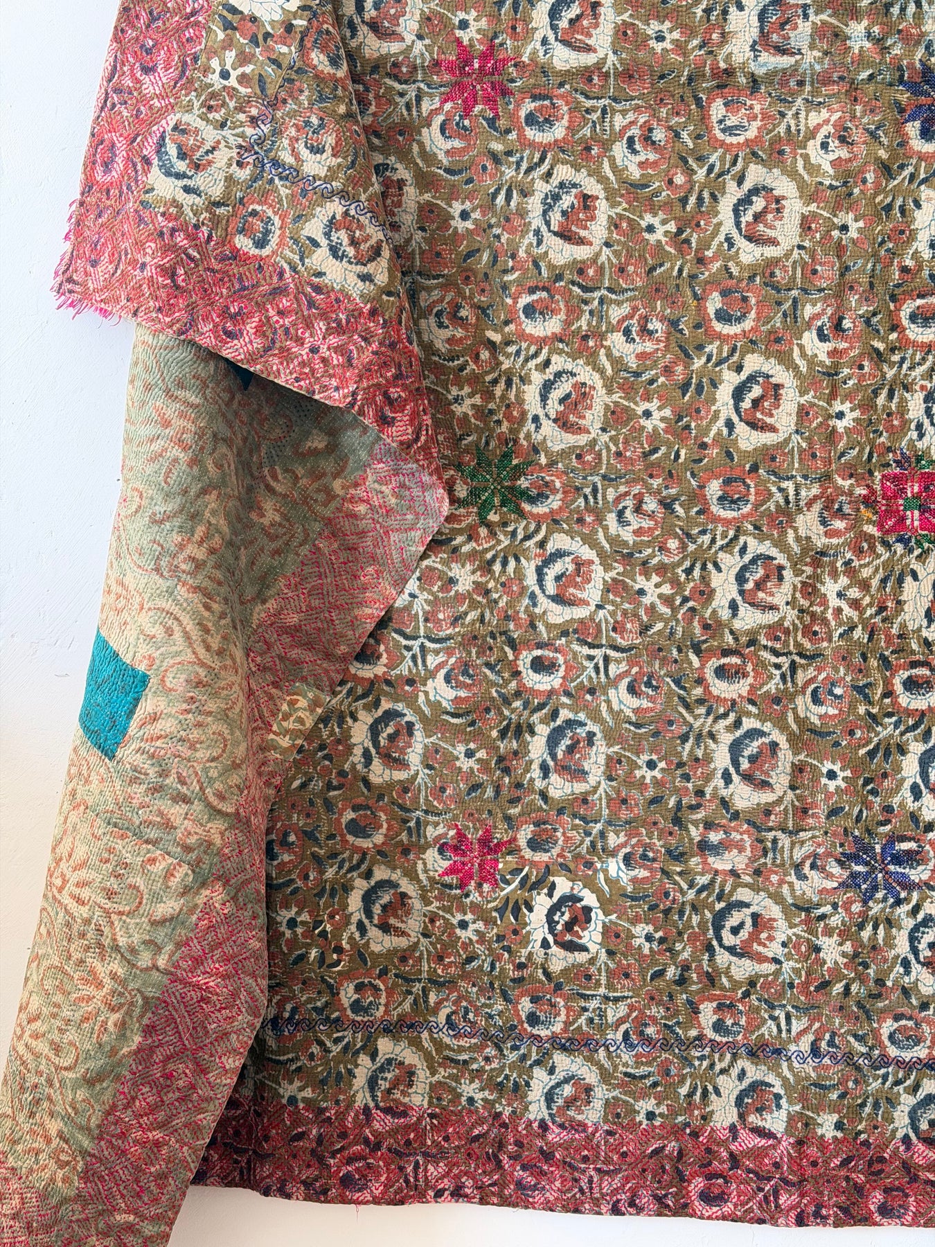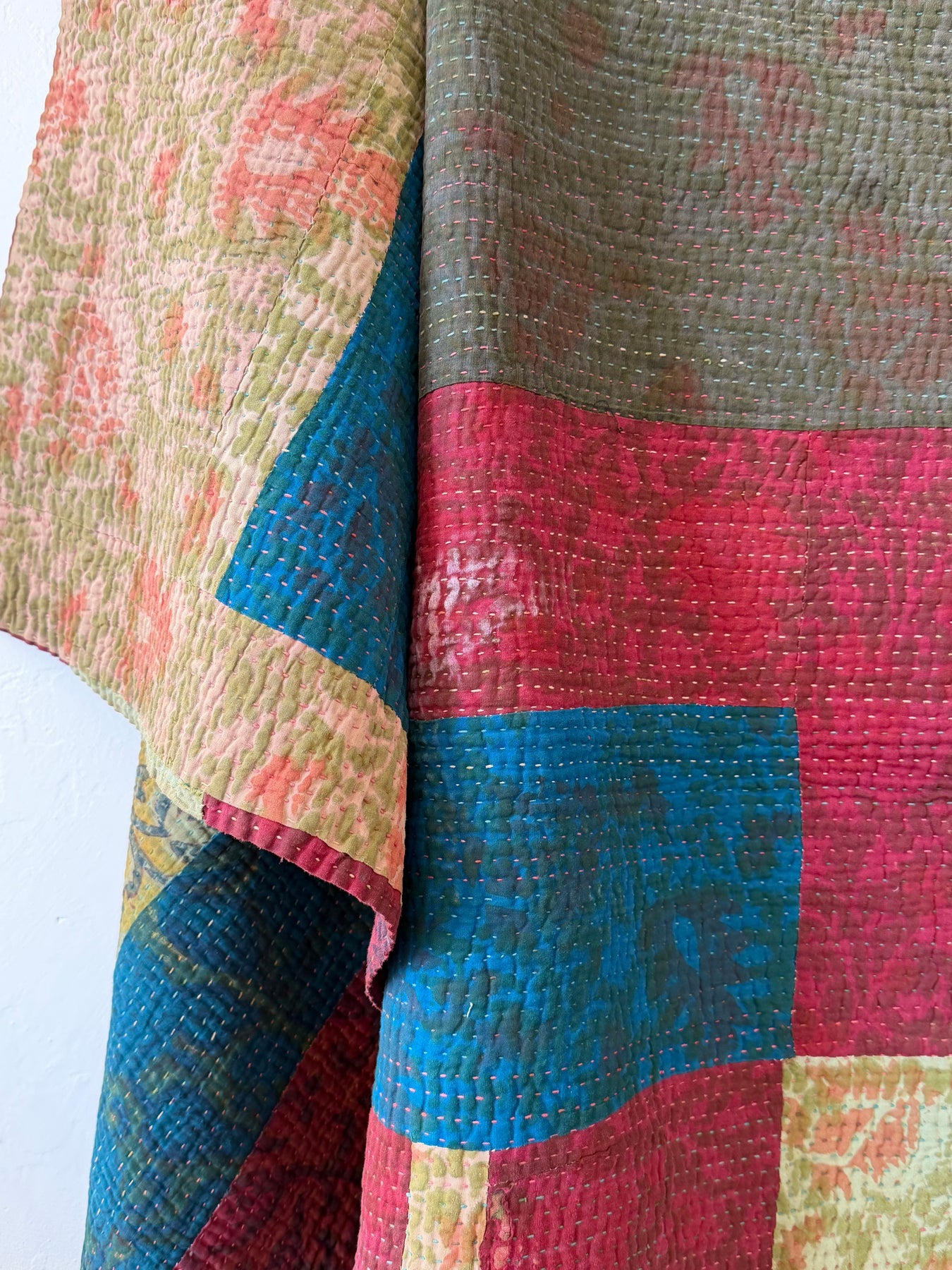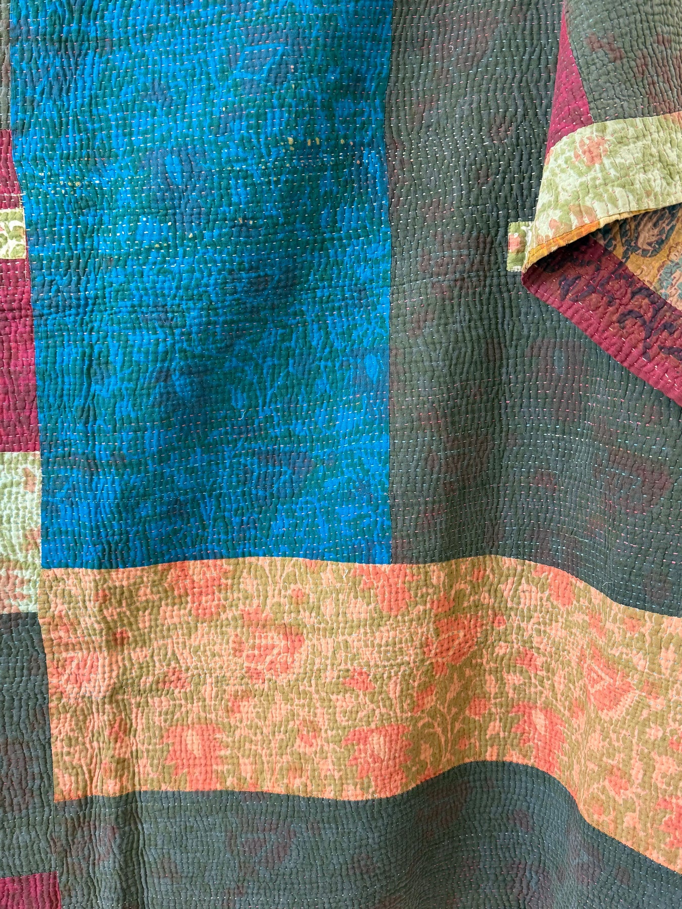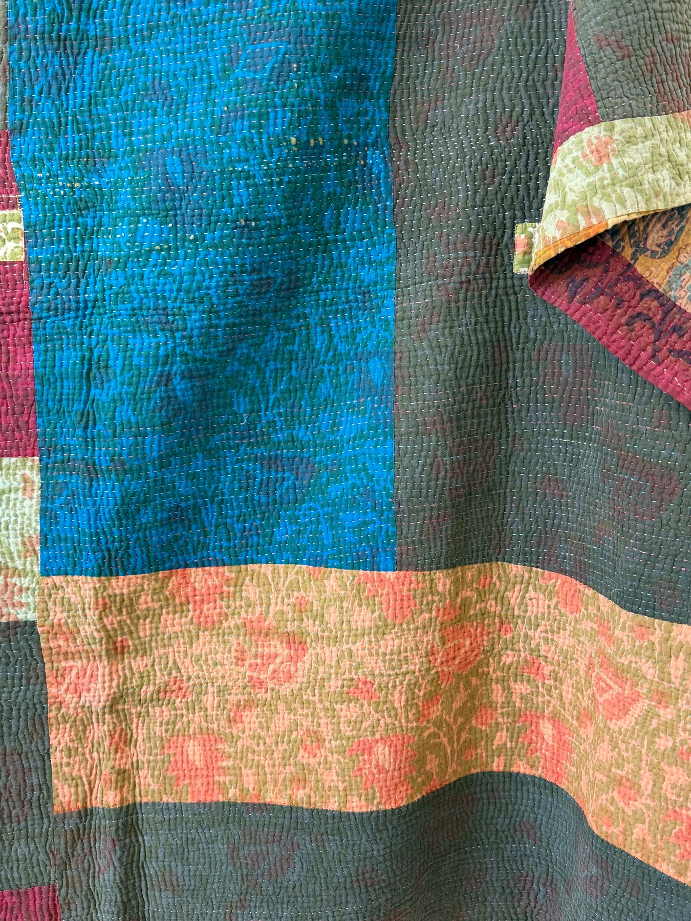 Le kantha est un art traditionnel de broderies, en utilisant Saris et fils colorés pour créer des dessins délicats, les couturières transforment d'anciens Saris en jolies couvertures.