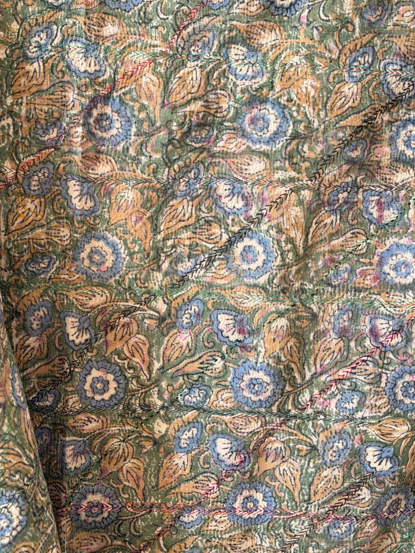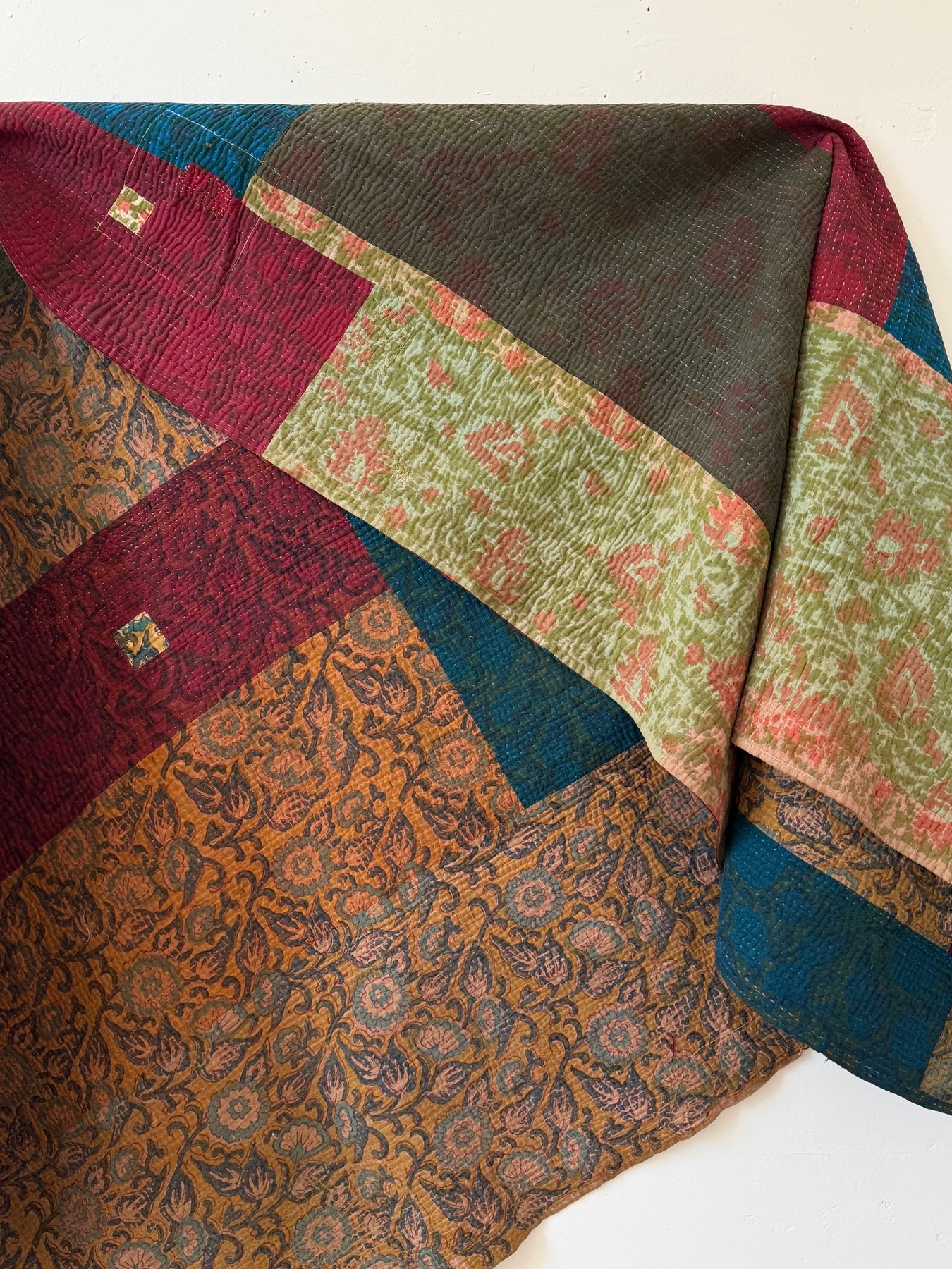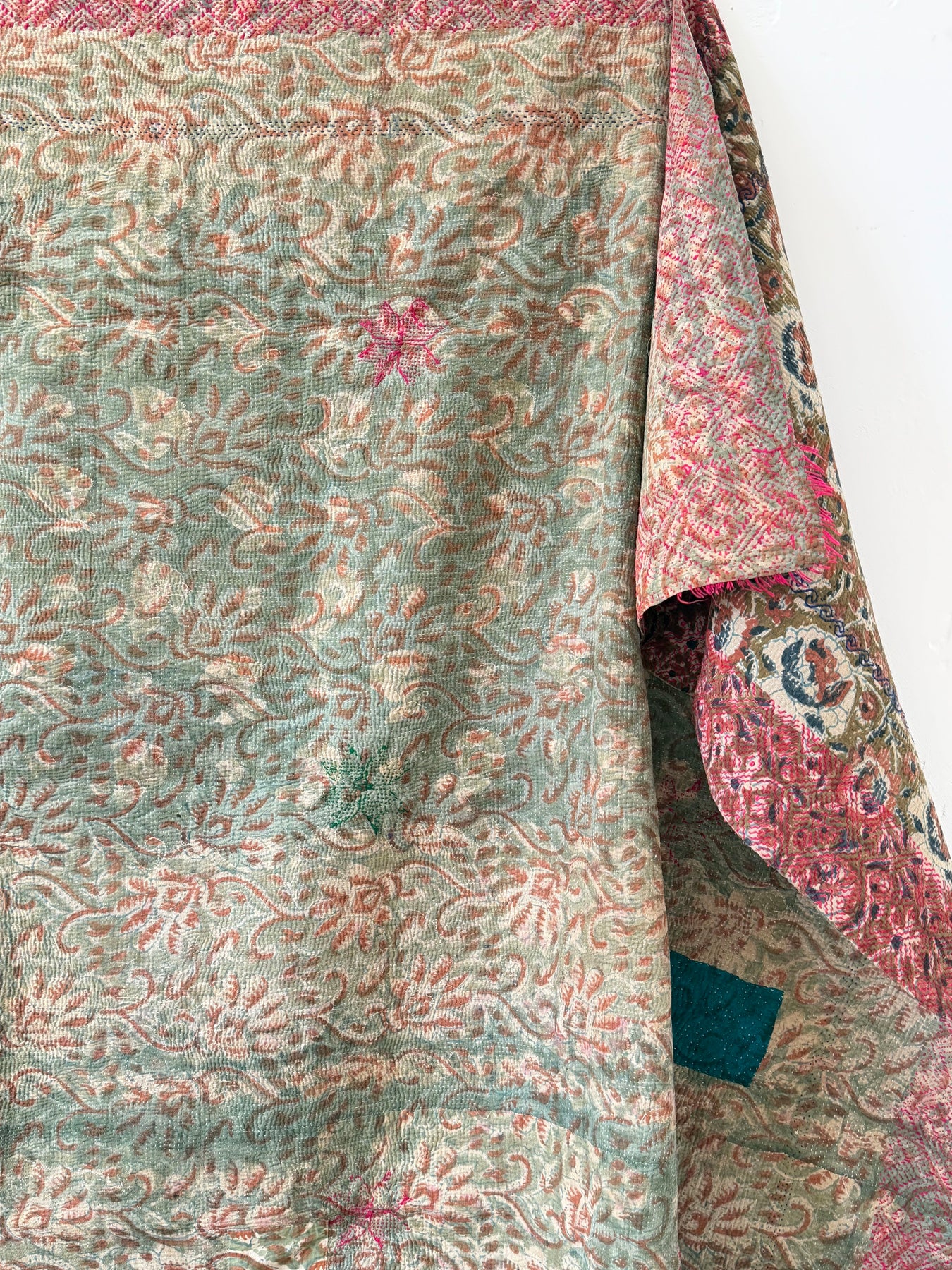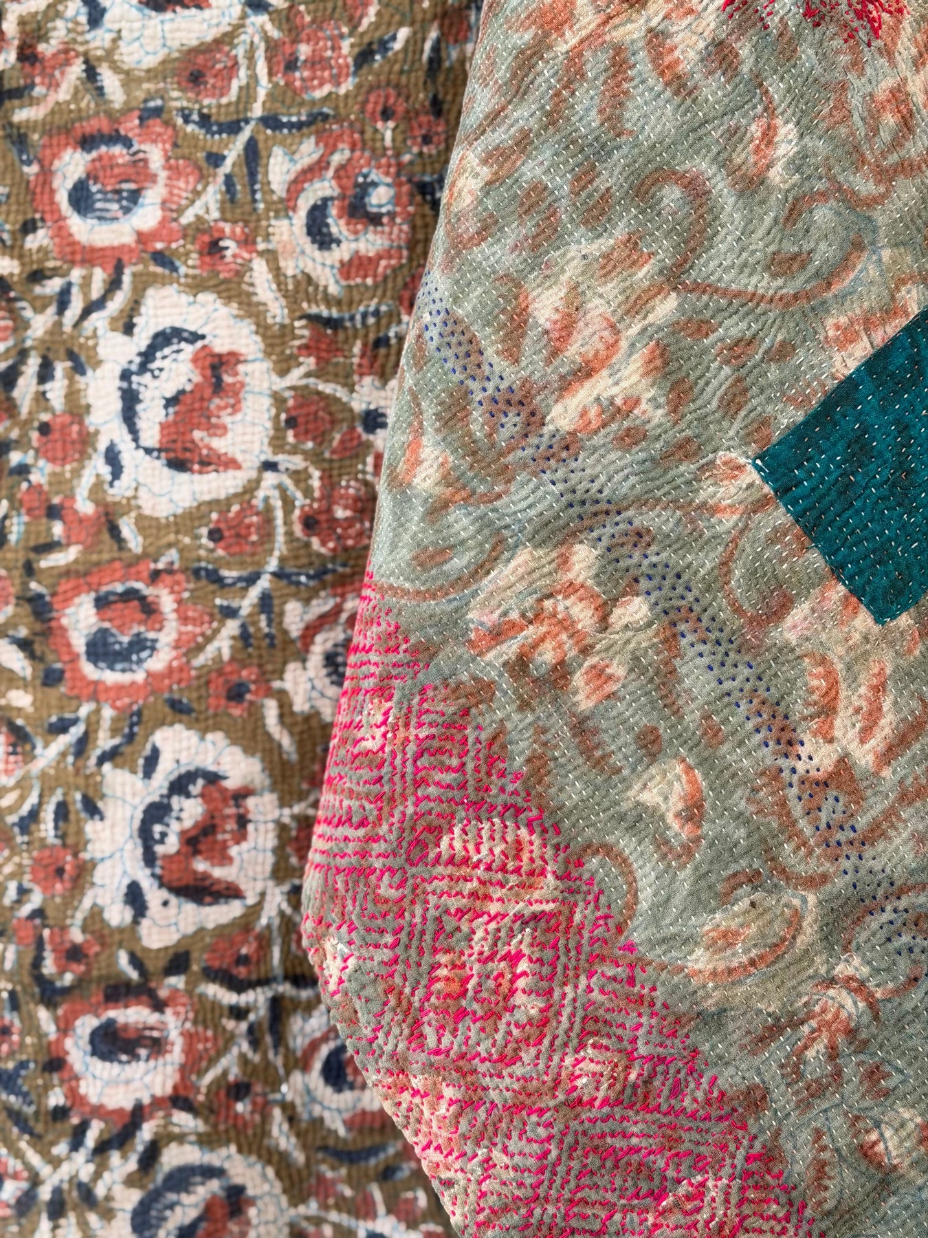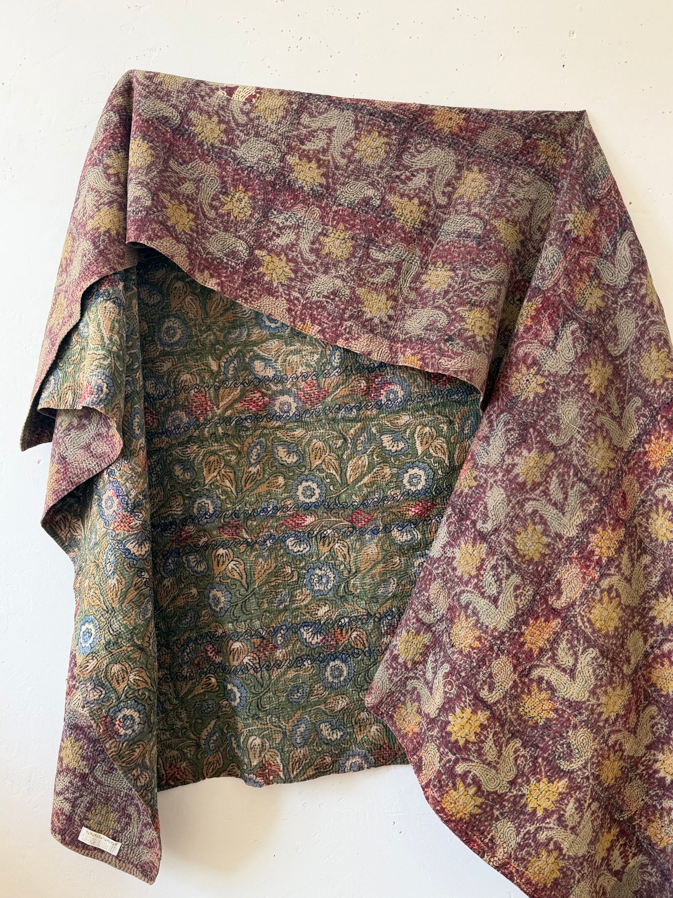 Le kantha est un art traditionnel de broderies, en utilisant Saris et fils colorés pour créer des dessins délicats, les couturières transforment d'anciens Saris en jolies couvertures.