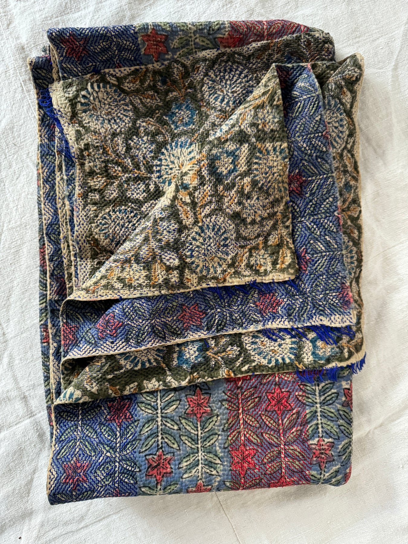 Le kantha est un art traditionnel de broderies, en utilisant Saris et fils colorés pour créer des dessins délicats, les couturières transforment d'anciens Saris en jolies couvertures.